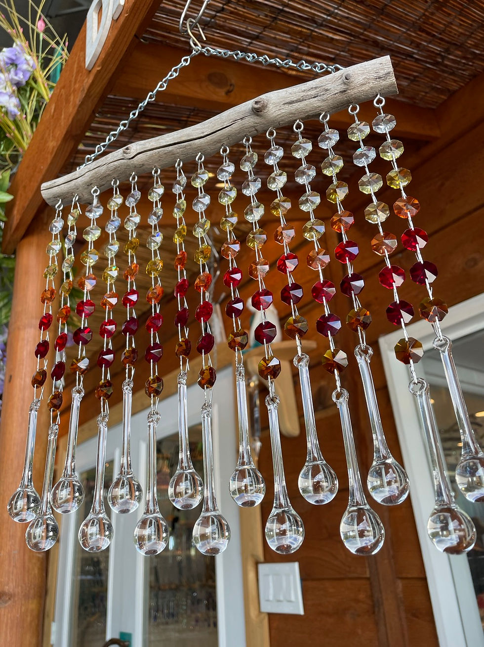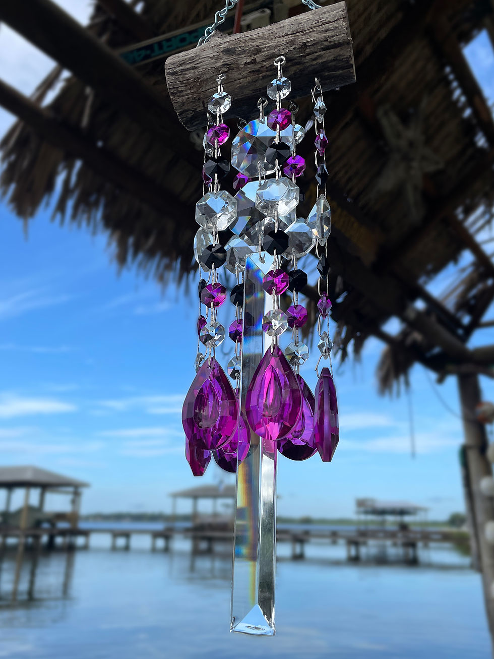 A delicate branch of driftwood draped in a glistening epoxy resin is the perfect base for sparkling chandelier prisms.